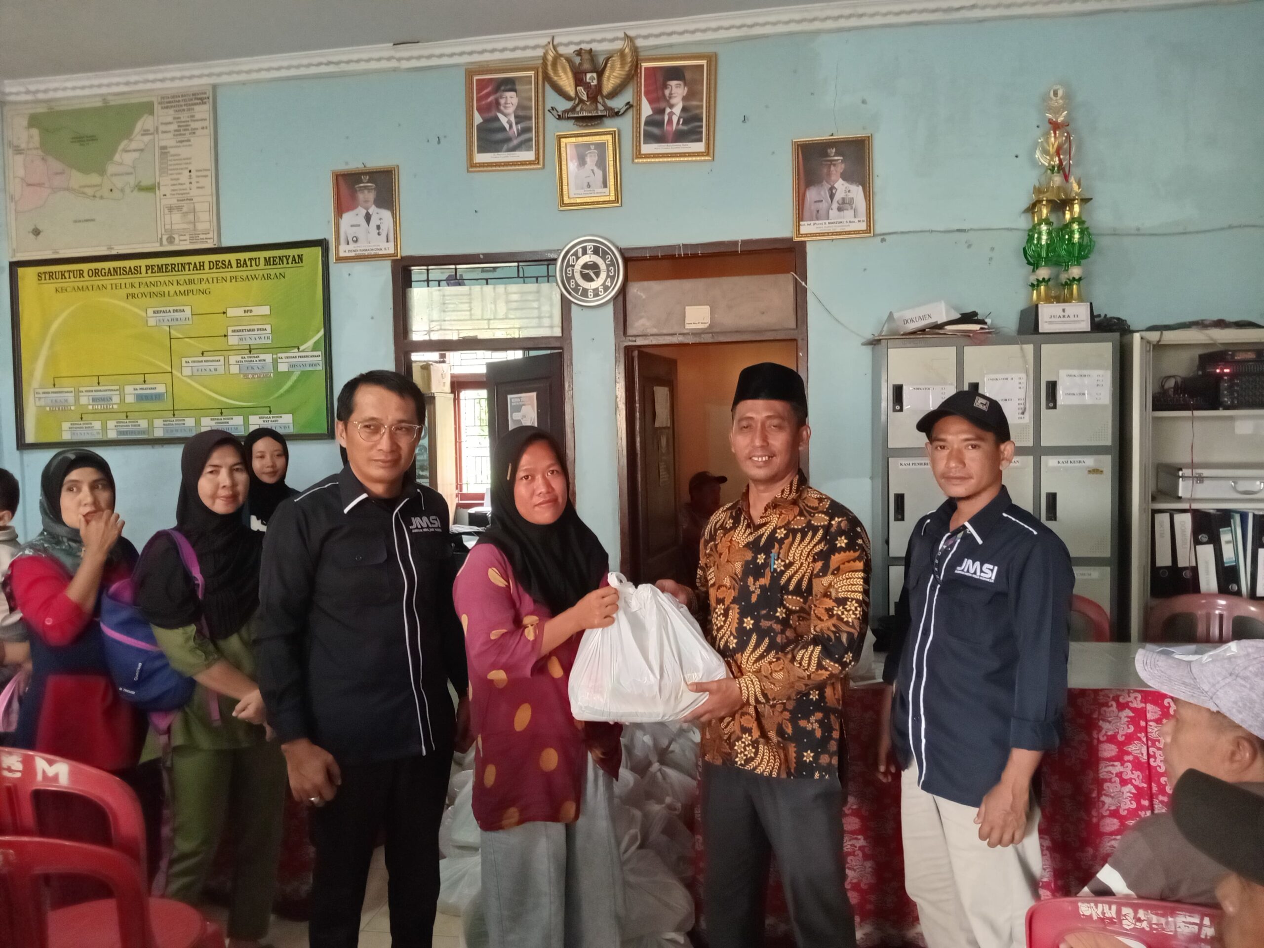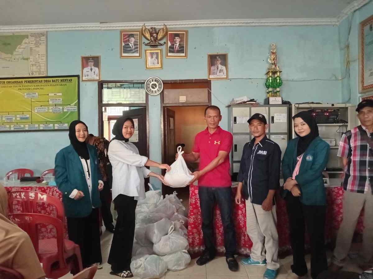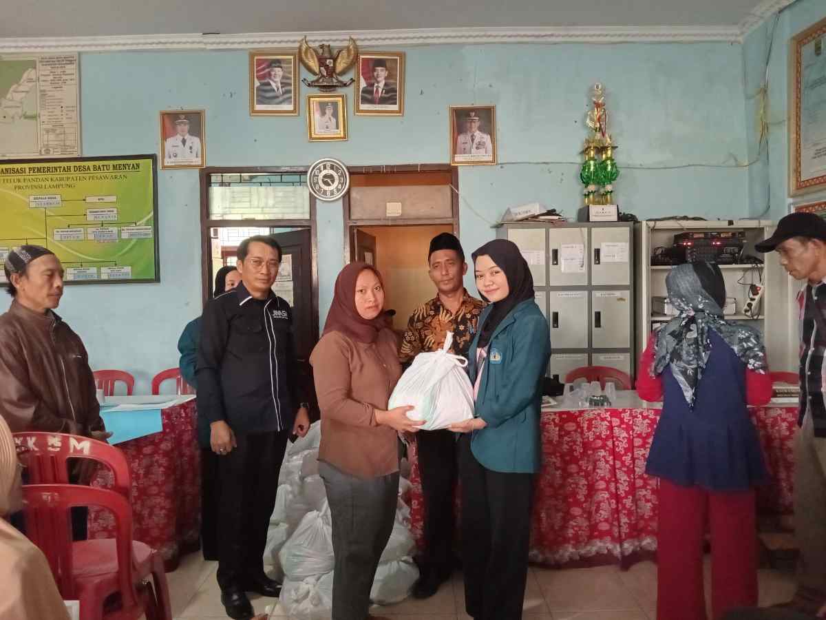 Penyerahan bantuan melalui “Kegiatan Bakti Sosial Kita Peduli” dengan Tema ‘Bantu Sesama Untuk Pesawaran Bermartabat’ ini, dilaksanakan di Balai Desa Batu Menyan dengan dihadiri Kepala Desa Syahruji, Sekretaris Desa Munawir dan seluruh aparatur desa hingga ketua RT.