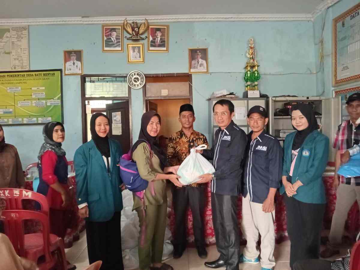 Pesawaran (LB): Jaringan Media Siber Indonesia (JMSI) berkolaborasi dengan Badan Amil Zakat Nasional (BAZNAS) Kabupaten Pesawaran bersama orang-orang baik yang menjadi donatur, serta mahasiswa yang tergabung UKMF Kelompok Studi Seni (KSS) FKIP, Unila langsung bergerak memberikan bantuan sembako kepada warga terdampak banjir di Desa Batu Menyan, Kecamatan Teluk Pandan, Kabupaten Pesawaran, Sabtu (22/2/2025).