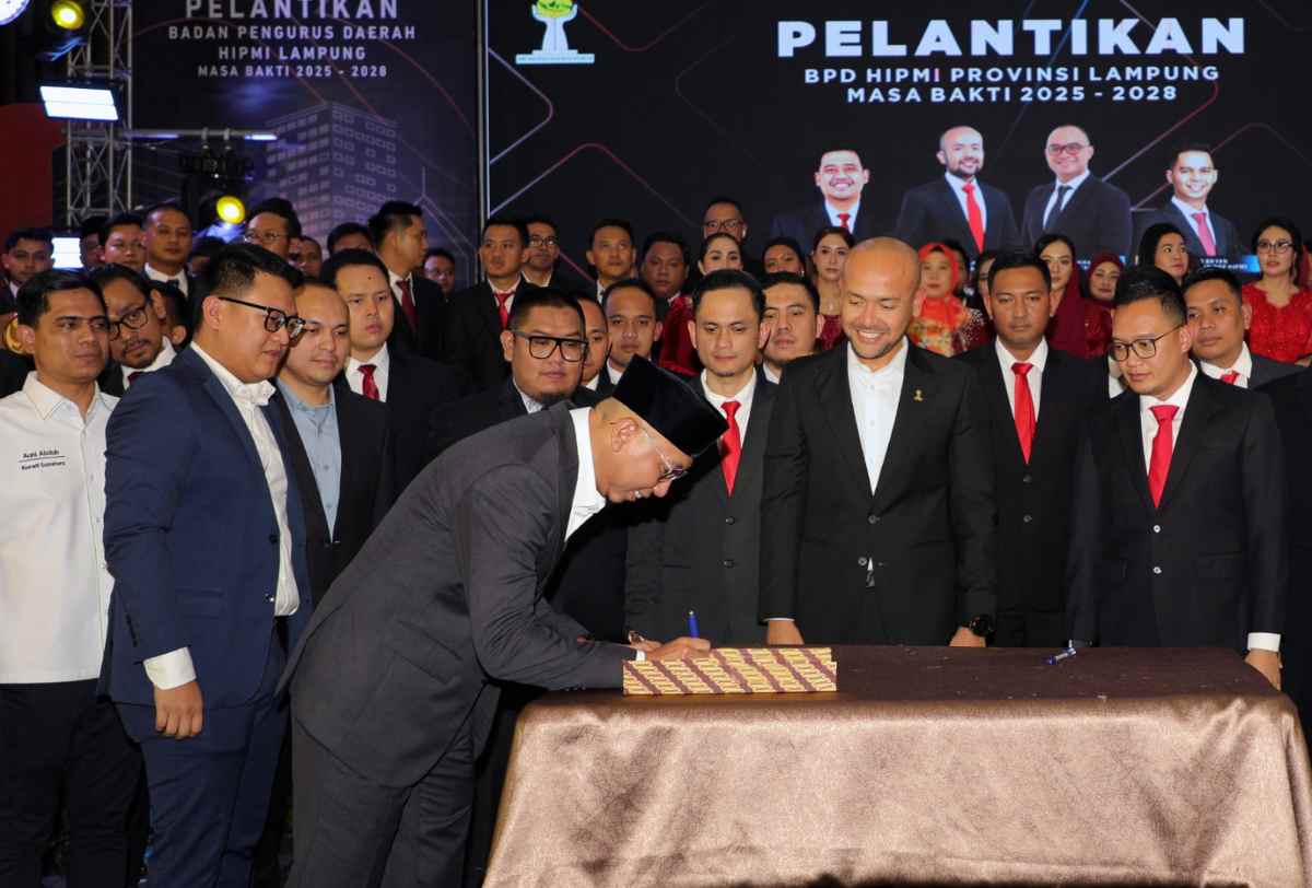Bandar Lampung (LB): Ketua Umum BPP HIPMI, Akbar Himawan Buchari resmi melantik Badan Pengurus Daerah (BPD) Himpunan Pengusaha Muda Indonesia (HIPMI) Provinsi Lampung Periode 2025-2028, Kamis (24/4/2025) malam di Mahan Agung, Bandar Lampung.