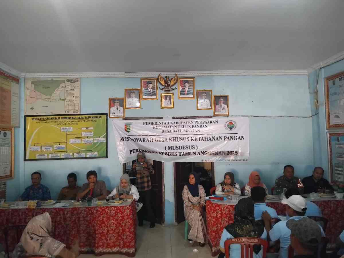 ‎Pesawaran (LB): Pemerintah Desa Batu Menyan, Kecamatan Teluk Pandan, Kabupaten Pesawaran, Lampung menggelar Musyawarah Desa Khusus (Musdesus) Ketahanan Pangan dan Musyawarah Desa (Musdes) Perubahan Anggaran Pendapatan dan Belanja Desa (APBDes) Tahun Anggaran 2025 di Kantor Desa Batu Menyan, Senin (5/5/2025).