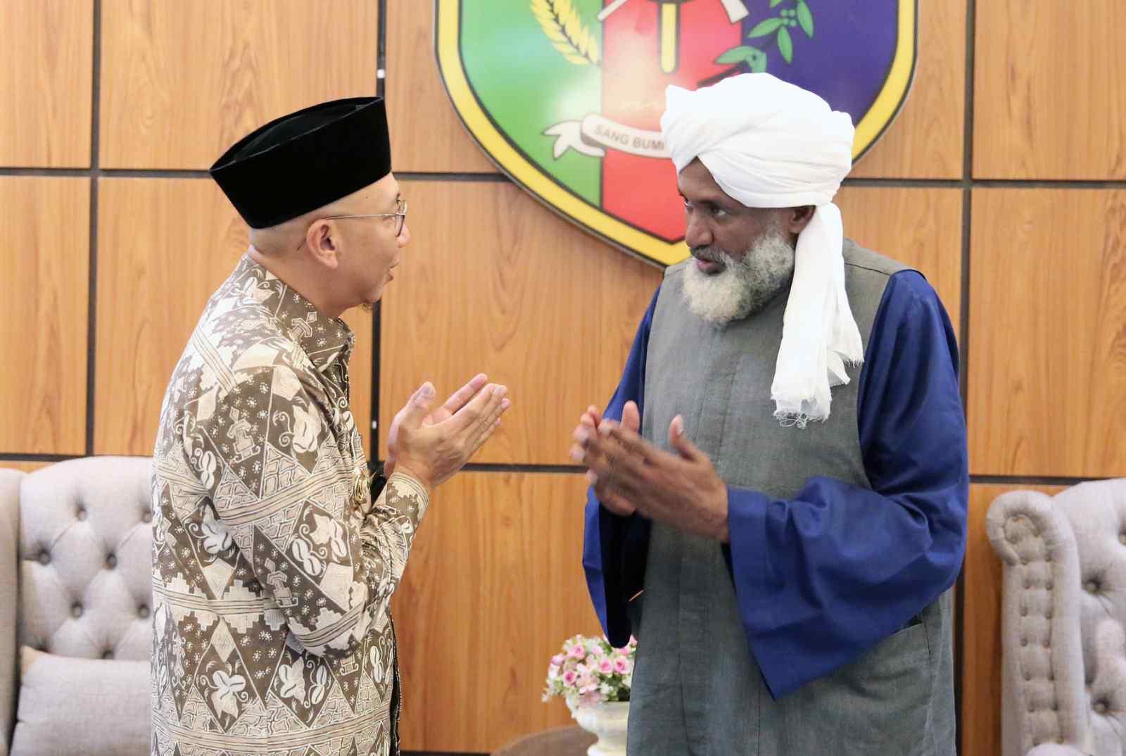 Bandar Lampung (LB): Gubernur Lampung Rahmat Mirzani Djausal menerima kunjungan ulama besar asal Sudan, Syaikh Awad Karim Utsman Al-Aqli, dalam rangka menyambung hubungan silaturahmi dan keilmuan (silatul ilmi), di Ruang Kerja Gubernur, Bandar Lampung, Kamis (15/5/2025).