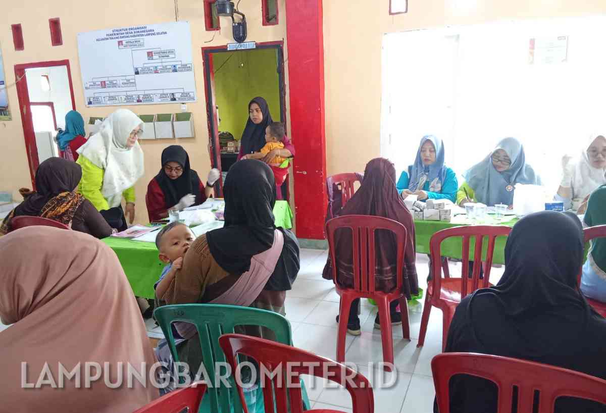 ‎Lampung Selatan (LB): Kader Posyandu Desa Sukanegara, Kecamatan Tanjung Bintang, Kabupaten Lampung Selatan melakukan imunisasi dan pengecekan kesehatan bagi bayi dan balita, ibu hamil dan lansia di balai desa setempat, Selasa (15/7/2025).