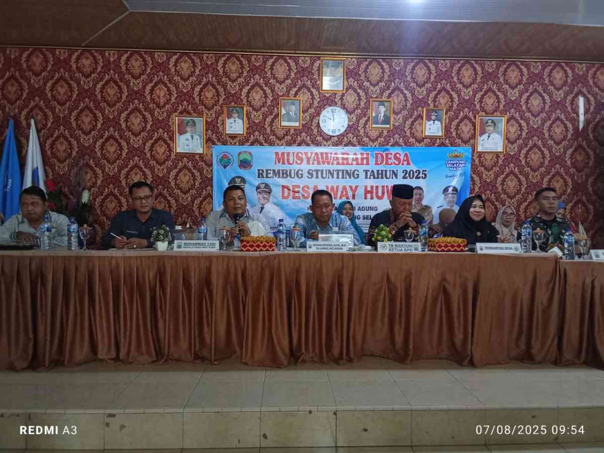 Lampung Selatan (LB): Pemerintah Desa (Pemdes) Way Huwi, Kecamatan Jati Agung, Kabupaten Lampung Selatan menggelar Musyawarah Rembug Stunting Tahun 2025 di ruang Aula Balai Desa Way Huwi, Kamis (7/8/2025).