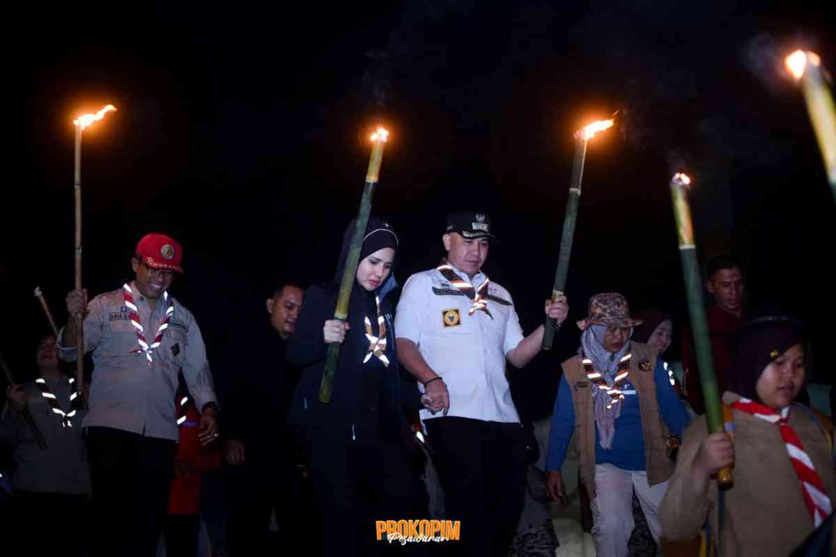 Pesawaran (LB): Ratusan pelajar dari berbagai sekolah memeriahkan Pawai Obor dalam rangka memperingati Hari Jadi Ke-18 Kabupaten Pesawaran sekaligus Hari Pramuka Ke-64, Rabu malam (13/8/2025).