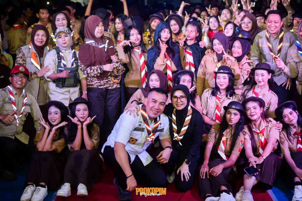 FOTO BERSAMA. Ketua Mabicab dan Ketua Kwarcab Gerakan Pramuka Pesawaran, Dr. Ir. H. Dendi Ramadhona K, S.T., M.Tr.I.P. dan Hj. Nanda Indira B, S.E., M.M. foto bersama siswa-siswi anggota Gerakan Pramuka dari berbagai sekolah.