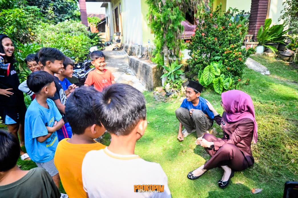 NGOBROL ASYIK. Tampak Bupati Pesawaran Nanda Indira asyik ngobrol dengan anak-anak saat mwninjau jembatan gantung di Desa Sukaraja, Gedong Tataan, Jumat (26/9/2025).