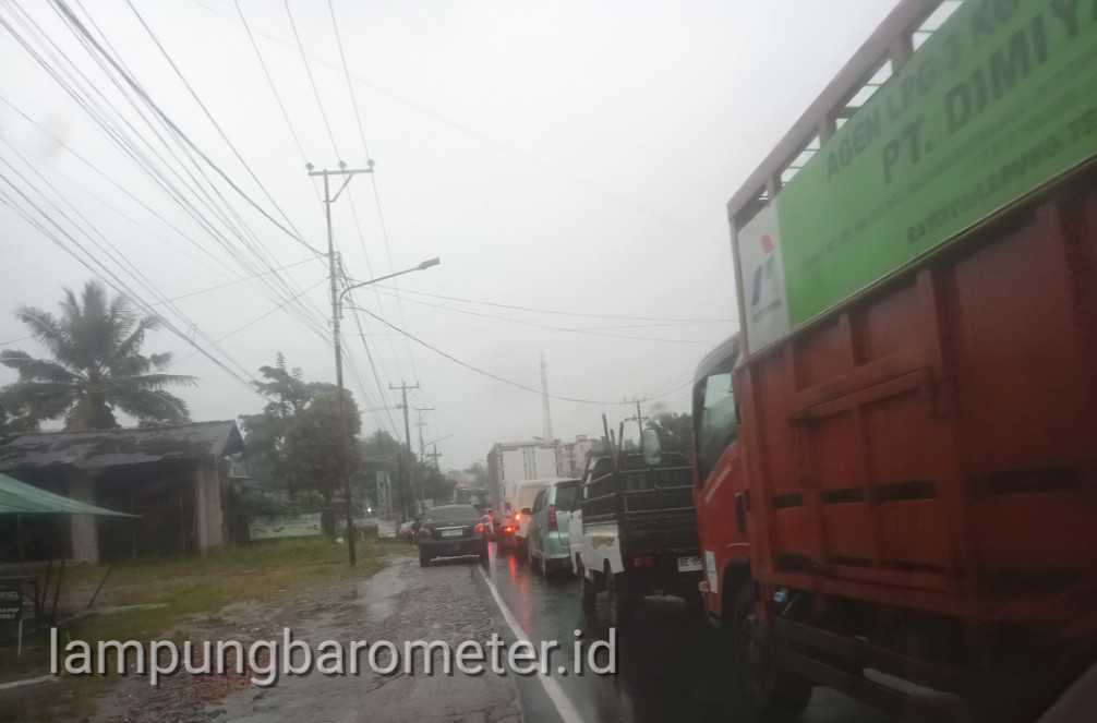 ‎Lampung Tengah (LB): Hujan deras yang mengguyur pada Senin (2/2/2026) pagi sekitar pukul 07.30 WIB, mengakibatkan kemacetan dan antrean panjang kendaraan di jalan lintas Sumatra, ruas Bandar Jaya – Poncowati.