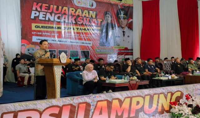 Bandar Lampung (LB): Gubernur Lampung Rahmat Mirzani Djausal diwakili Sekretaris Daerah Marindo Kurniawan, membuka Kejuaraan Pencak Silat Gubernur Cup I Tahun 2026 yang selenggarakan Ikatan Pencak Silat Indonesia (IPSI) Provinsi Lampung di Gedung Sumpah Pemuda PKOR Way Halim, Bandar Lampung, Jumat (17/4/2026).