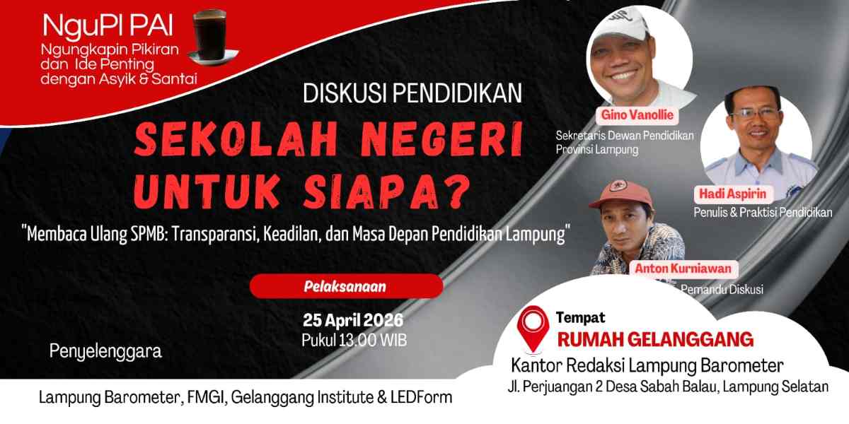 Diskusi santai yang menghadirkan narasumber pakar pendidikan Gino Vanollie dan penulis sekaligus praktisi pendidikan Hadi Aspirin akan dilaksanakan di Rumah Gelanggang, Kantor Redaksi Lampung Barometer, Jalan Perjuangan 2 Desa Sabah Balau, Lampung Selatan, Sabtu (25/4/2026).